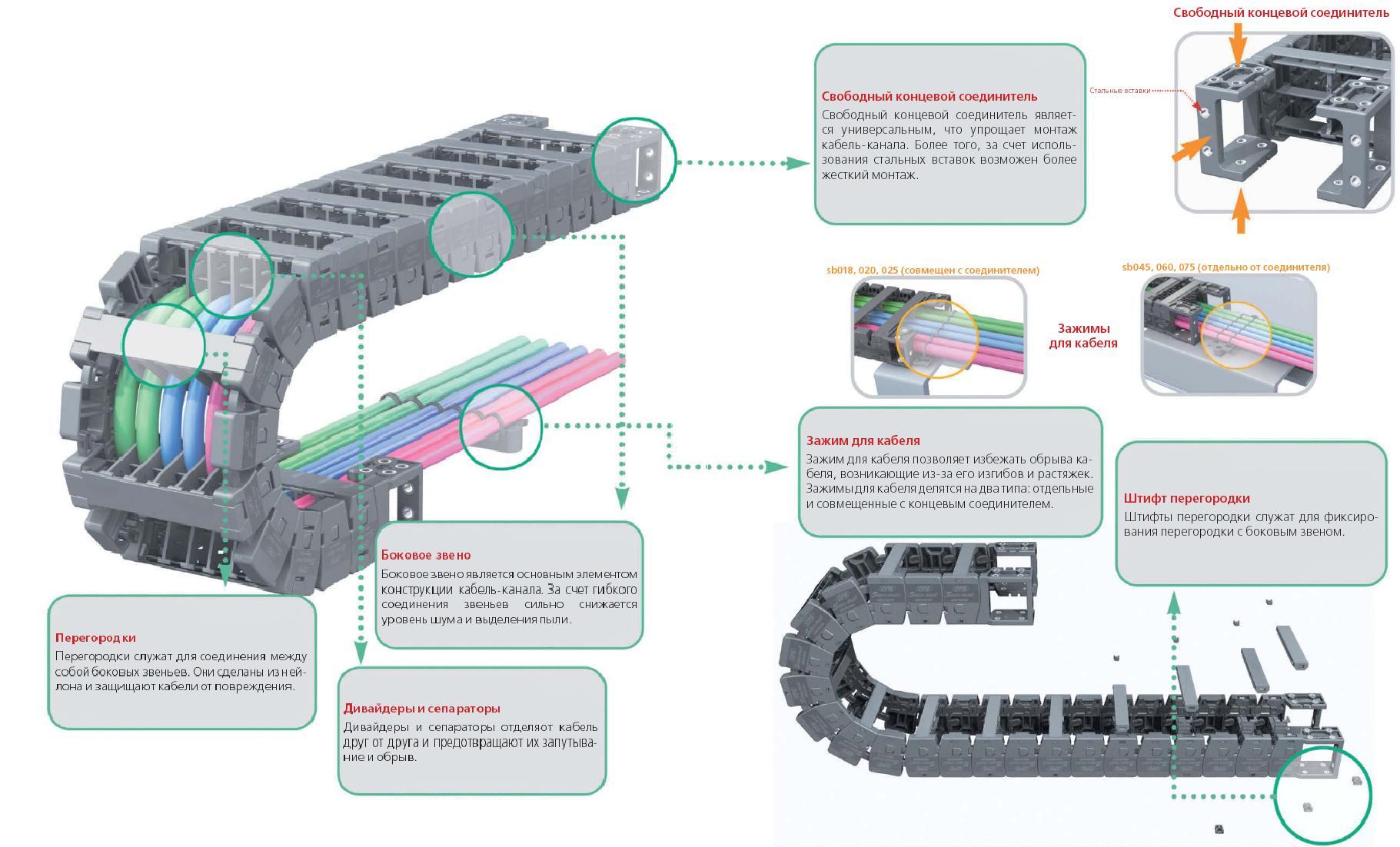 Скользящий - Sliding (S-Type) Создан для больших перемещений, когда из-за значительного веса кабеля применение N- и Е-типов Sabin недопустимо. В конструкции применены роликовые опоры, которые уменьшают коэффициент трения, а следовательно снижается уровень шума, увеличивается допустимая скорость перемещения, безопасность, жизненный цикл механизмов. Скользящие гибкие кабель-каналы Sabin Chain подробнее >>> |