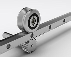 Функция перемещения под нагрузкой реализуются в самых разных станках и механизмах, соответственно к системам перемещений часто могут предъявляться свои, специфические требования по точности позиционирования, скорости перемещения, ускорению, перемещаемой массе и т.д. В связи с широким спектром применения таких систем очень часто требуется обеспечить возможность быстрой сборки готовой конструкции из отдельных компонентов. Собственное производство компонентов привода дает возможность оперативно реагировать на запросы клиента и максимально точно и эффективно решать поставленные задачи. Можно сказать, что модная сегодня теория массовой кастомизации как стратегии завоевания рынка была известна и применялась в компании Gudel более 50 лет и применяется до сих пор. Так, например, для удобства конструирования системы линейных перемещений Gudel делятся на типоразмеры. Каждый типоразмер включает полный набор компонентов - профиль, направляющие рейки, ролики, роликовые обоймы и каретки, зубчатые направляющие рейки, зубчатые рейки и шестерни, гофрированную защиту, стопорные буферы, смазочные системы и системы уплотнений, переходные плиты и системы креплений для редукторов. Серии систем перемещений для средних нагрузок включают типоразмеры 10, 15, 20, 25, 35. Серии для больших нагрузок - 40, 52, 62, 72, 90, 110. Основой для систем перемещений являются стальные и алюминиевые профили с различными характеристиками (в том числе по жесткости и нагрузочной способности). Стальные профили имеют сечение от 50х100 мм (для небольших нагрузок) до 403х405 мм (для перемещения больших масс). Алюминиевые профили имеют типоразмеры от 50х60 мм до 277х280 мм. Все профили имеют пазы под гайки для упрощения монтажа на станину, а также для присоединения дополнительных узлов и элементов. Важным конструкционным элементом в системах Gudel является стальной двутавровый шлифованный профиль. К нему крепятся трапецеидальные или прямоугольные рельсовые направляющие, зубчатые рейки и зубчатые направляющие рейки. Возможен заказ профиля с интегрированными и точно выставленными направляющими рейками. В зависимости от выбранных направляющих в системах используется несколько видов роликов - гладких и с трапецеидальной канавкой. Размеры и конструкция роликов зависит от выбранного типоразмера направляющих. В соответствии с требованиями к системе по нагрузкам, ролики на подшипниках устанавливаются в роликовой обойме или присоединяются к кареткам через специальные фланцы. Роликовые обоймы закрываются специальными защитными кожухами и снабжаются системой подачи смазки. Сами направляющие также снабжены системой защиты, а для предотвращения попадания механических частиц в обоймы на них ставятся специальные уплотнения. Стандартные роликовые обоймы оснащаются двумя или тремя роликами. К кареткам через переходные фланцы крепятся прецизионные червячные редукторы, оснащенные муфтами, компенсирующими радиальные и осевые нагрузки на входном и выходном валах. В системах для средних нагрузок зубчатые направляющие рейки выполняют две функции: обеспечивают точное линейное перемещение каретки (в паре направляющая - ролик) и преобразование крутящего момента в возвратно-поступательное движение (в паре зубчатая рейка - шестерня). Зубчатые направляющие могут иметь как прямой, так и трапецеид